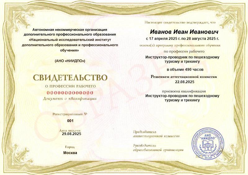 Инструктор-проводник по пешеходному туризму и трекингу может официально проводить походы после аттестации. Чтобы ее пройти, нужно предоставить диплом о среднем или высшем профессиональном образовании по специальностям, связанным с туризмом, либо диплом о профессиональной переподготовке / удостоверение о повышении квалификации / свидетельство об окончании курсов.