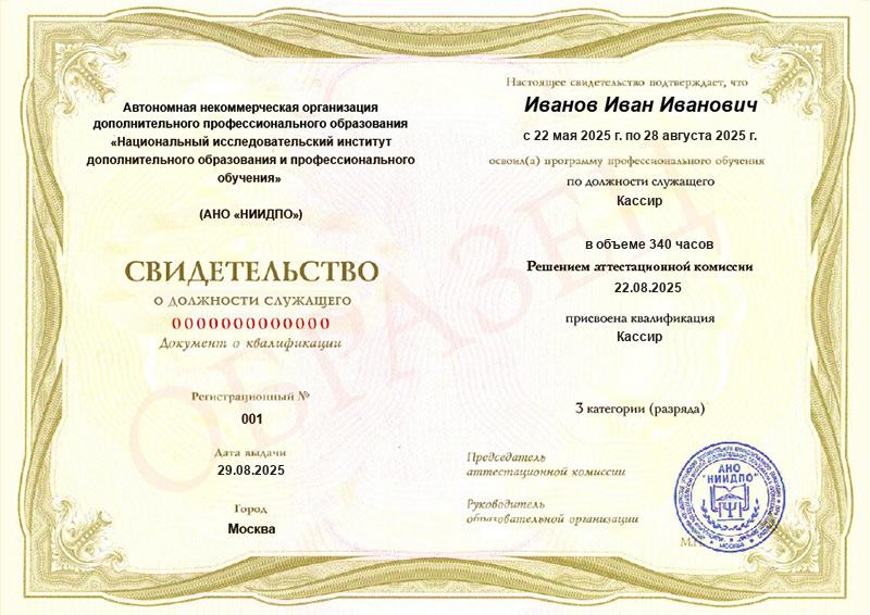 - Документ о квалификации: свидетельство о должности служащего установленного образца
