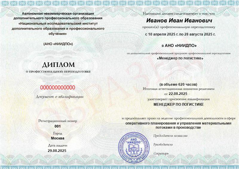 - Диплом о профессиональной переподготовке с квалификацией менеджера по логистике