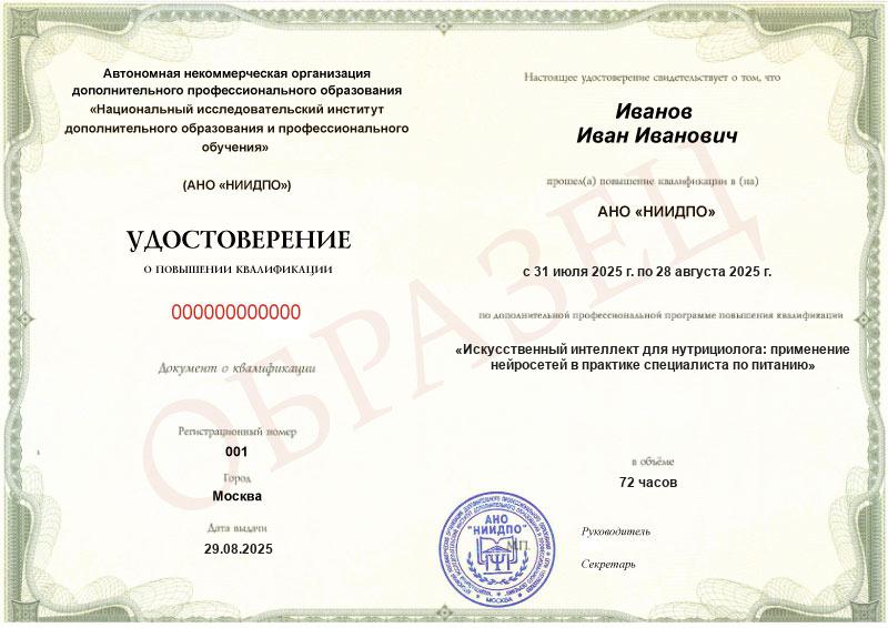 Обзор программы повышения квалификации «Искусственный интеллект для нутрициолога: применение нейросетей в практике специалиста по питанию»