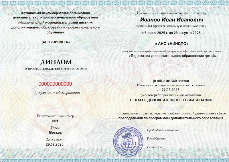 Студент, желающий поступить в АНО «НИИДПО», должен предоставить справку из образовательной организации. Независимо от срока окончания обучения по программе дополнительного образования, диплом о профпереподготовке выдаётся только после предъявления документа о получении среднего профессионального или высшего образования.