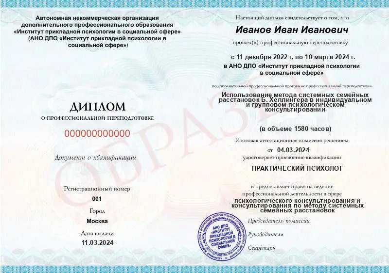Диплом о профессиональной переподготовке после нашего обучения делает специалиста более авторитетным в глазах клиентов и коллег и позволяет успешно строить практику.