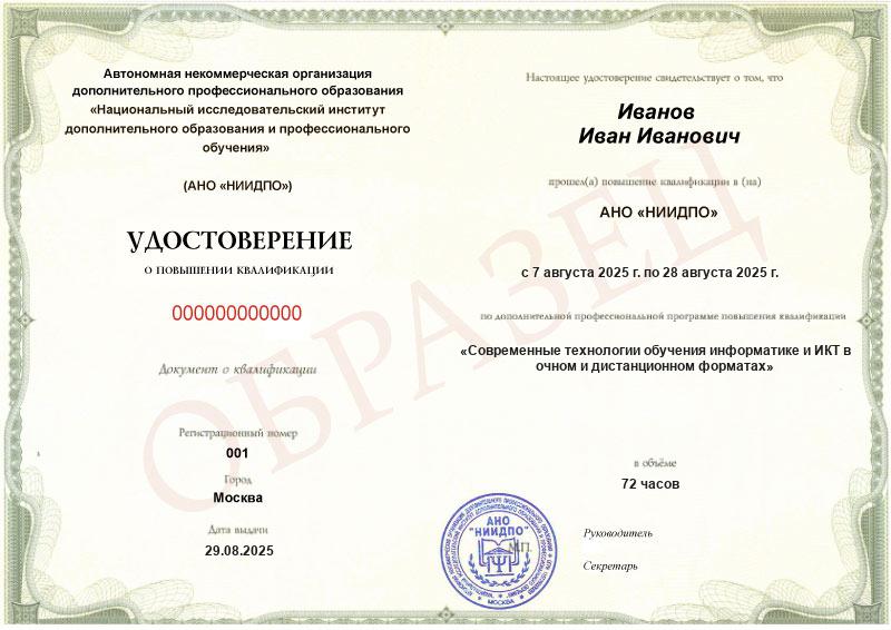 Да, документы оформляются на бланках с защитой от подделок, заполняются на русском языке, в них ставится печать АНО «НИИДПО».