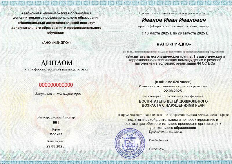 Программа разработана с учетом требований профстандартов «Педагог (педагогическая деятельность в сфере дошкольного, начального общего, основного общего, среднего общего образования) (воспитатель, учитель)», «Педагог-дефектолог» и ФГОС по направлению подготовки 44.03.03 Специальное (дефектологическое) образование. По окончании обучения вы получите диплом, который принимают работодатели и аттестационные комиссии, и сможете официально работать в логогруппах.